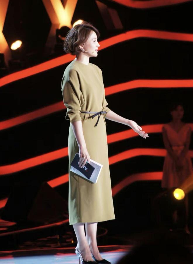 “越简约越高级”的含金量,在董卿身上体现的淋漓尽致。基础款式的卡其色连衣裙,不加多余的装饰、裁剪,强调直线条设计,系条细腰带,显瘦又显高,尖头细跟鞋的搭配,更是显得女人味儿十足。