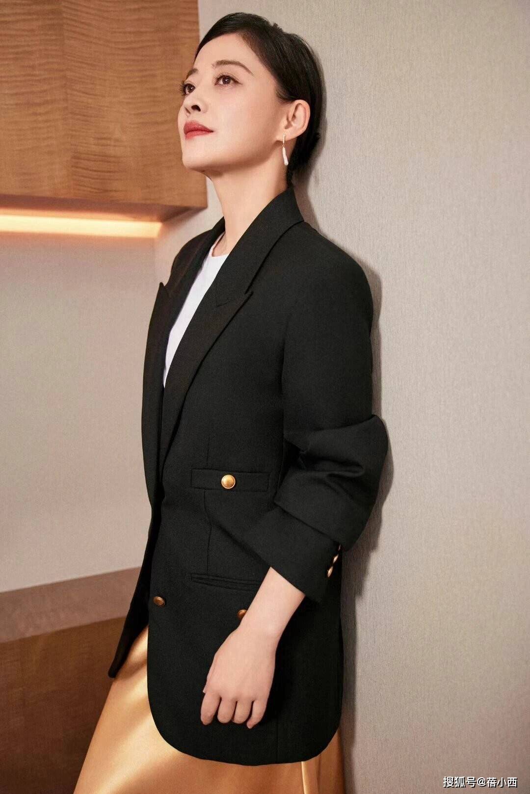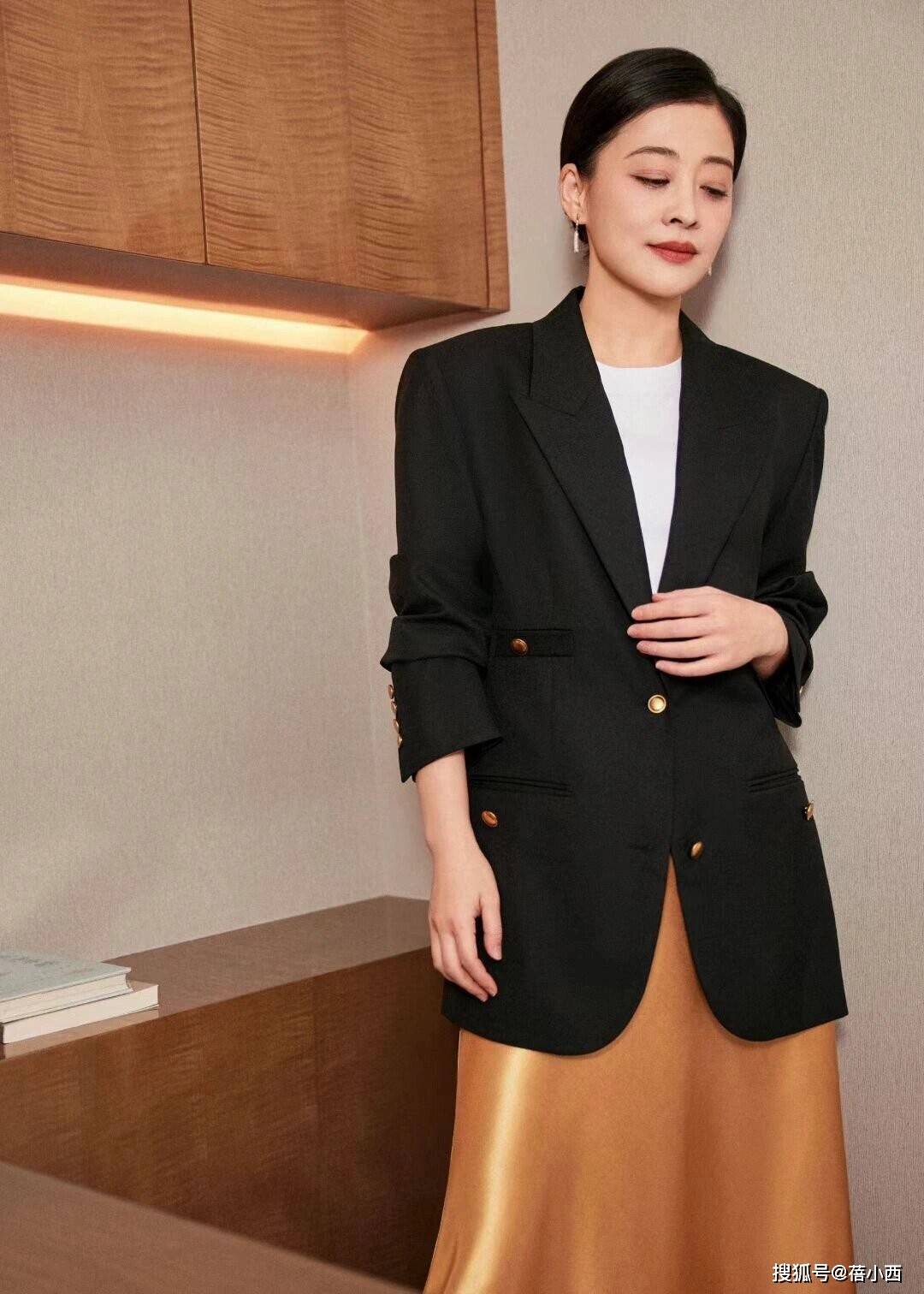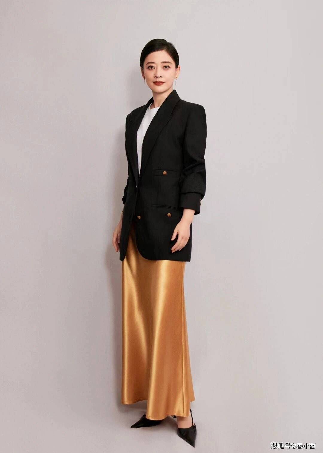 黑色西装搭配香槟金色长裙,是此类风格的经典组合。很多人存在的误区是衣服越宽松越显瘦,但实际效果往往并非如此。微胖身材的穿搭,往往需要适度的修身来勾勒轮廓。梅婷这件黑色西装选用的面料显贵,版型修身但不过分紧绷,呈现出与传统紧身西装截然不同的时尚感。西装上的金色纽扣与下装的金色半身裙相呼应,金黑配色自带奢华气息,提升整体质感。