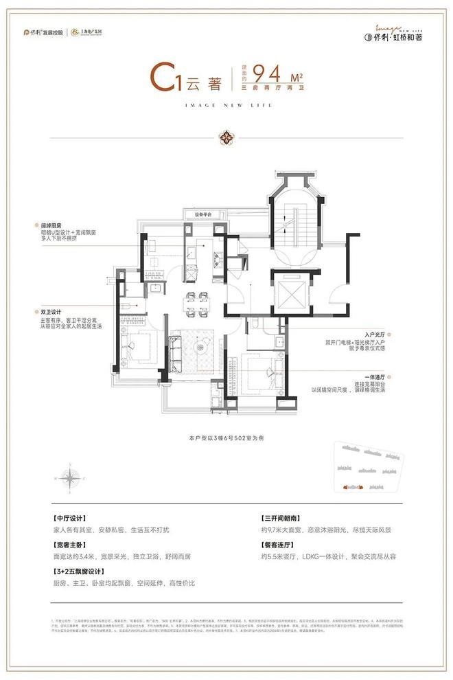 保利虹桥和著售楼处电线㎡三房户型采用南北通透的飞机户型布局,无过道浪费,功能分区合理,采用LDKG(客餐厨一体化)设计,阳台270°采光,多飘窗设计增加了空间的利用率和视觉感。这一户型空间利用率高,视觉与实际居住感舒适,适合刚需及改善人群。