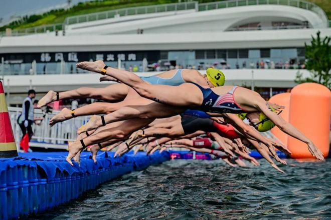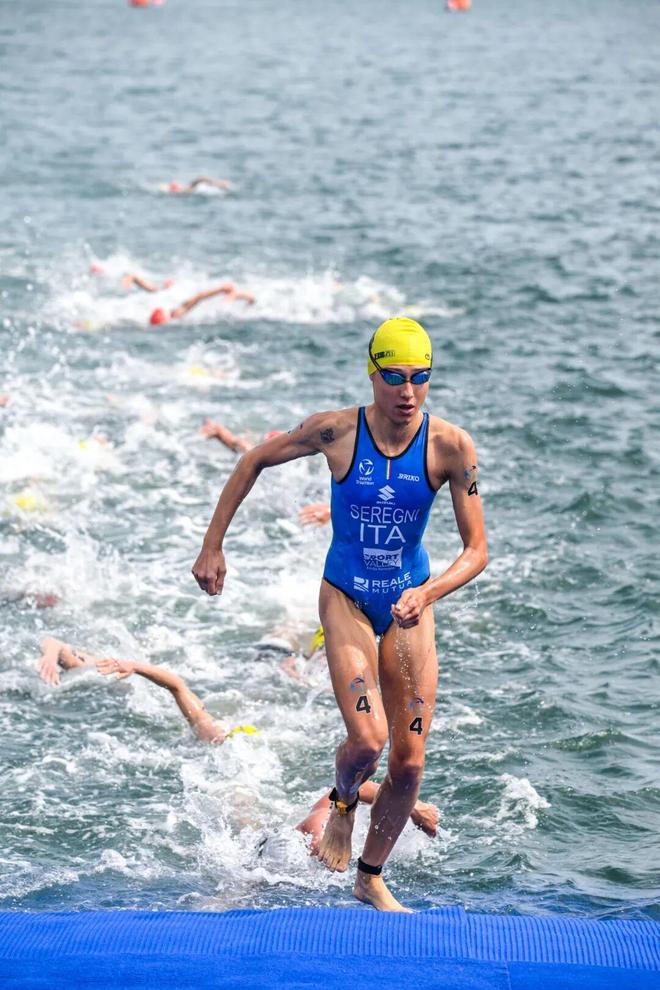 游泳赛段的竞争从跳发瞬间便进入白热化,1.5公里的游泳赛段中,选手们如离弦之箭般劈波斩浪。最终,来自意大利的年轻小将比安卡·塞雷尼(Bianca Seregni)凭借出色的游泳能力脱颖而出,以00:19:26的成绩率先起水,进入转换区。