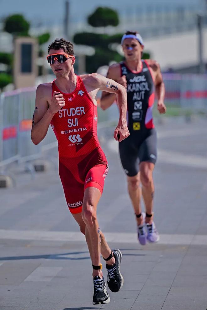 自行车赛段的硝烟尚未散尽,奥地利运动员捷贝·凯因德尔(Tjebbe Kaindl)与瑞士运动员马克斯·斯图德(Max Studer)已凭借利落的动作抢占先机,迅速完成T2换项,随即率先进入决胜的跑步赛段。对冠军的极度渴望,让斯图德从赛段开始便展现出碾压级的统治力。他步频稳健且爆发力十足,丝毫未给身后的追击集团留下喘息空间,领先优势从第一圈的12秒,在第二圈时已强势拉开至35秒。格拉夫虽拼尽全力加速追赶,但却始终无法撼动斯图德势如破竹的领先态势,只能眼睁睁看着两人的距离不断拉大。