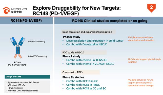 RC148 是一种靶向 PD-1 和 VEGF 的双特异性抗体,是荣昌生物利用双抗技术平台开发的创新药分子,目前该药物在中国开展的单药及联合治疗晚期实体瘤临床研究正在顺利推进中。