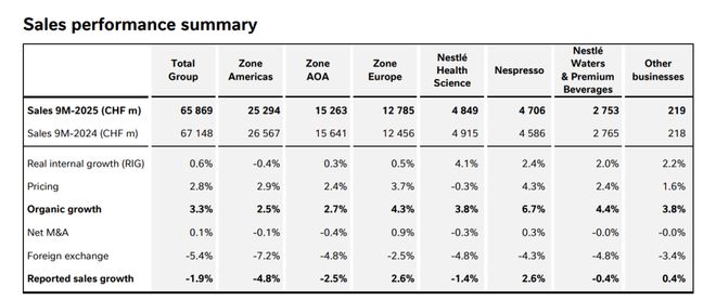 10月16日,雀巢发布2025年前三季度财报。财报显示,公司前三季度销售额达658.7亿瑞士法郎(折合人民币约5652.77亿元),实际内部增长率为0.6%,定价贡献率为2.8%。按地区划分,发达市场有机增长率为2.1%,实际内部增长与定价贡献基本持平;新兴市场有机增长率为5.2%,受定价贡献推动,实际内部增长与定价贡献基本持平。按品类来看,咖啡和糖果是有机增长的最大贡献者,这一增长由定价驱动,部分市场实现了两位数增长。按渠道来看,零售销售额有机增长3.1%,户外渠道有机增长6.2%,电商销售额有机增长13.2%,占集团总销售额的20.2%。