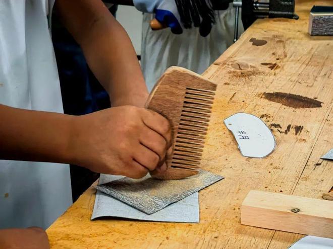 制作过程中,只见长方形的木梳胚子被台钳稳稳固定,“小木匠”手握钢丝锯,对准设计好的木梳造型来回锯动。不一会儿,郑恩善的钢丝锯下,一条小鱼初具雏形。“锉刀要这样,斜着磨,会好磨很多。”身后,李朵儿示范起自己刚刚学到的新技巧,手中的小猫梳已经调皮地探出了两个耳朵。“外形出来以后,先用锉刀顺滑、倒角,随后砂纸也要派上用场,打磨抛光同样不能马虎。”顾剑在操作台间来回穿梭,遇到工具使用不规范的孩子,他都要手把手教。
